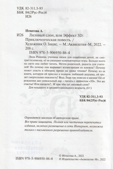 Лида Рощина, ученица лицея для одарённых детей, не смотрит телевизор, её не увлекают компьютерные игры. Больше всего на свете она любит читать. Мечта родителей, радость для учителей! Но почему она вырывает иллюстрации из книжек? Почему может упасть в обморок прямо на уроке чтения? Почему из-за книги, которую ей прислал в подарок любящий дедушка, ей грозит смертельная опасность? Ведь Лиде так повезло в жизни! Ей от рождения дан уникальный дар - читать с эффектом "3D". Это же счастье! Или напасть?.. И при чём тут Лиловый слон?