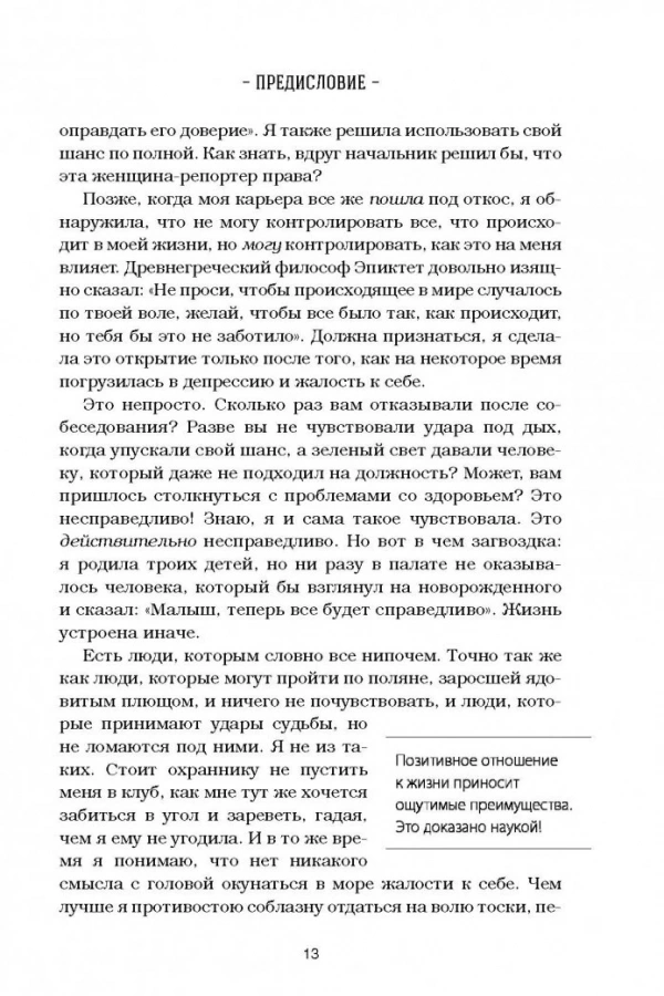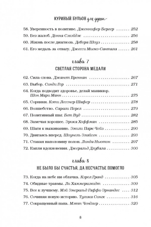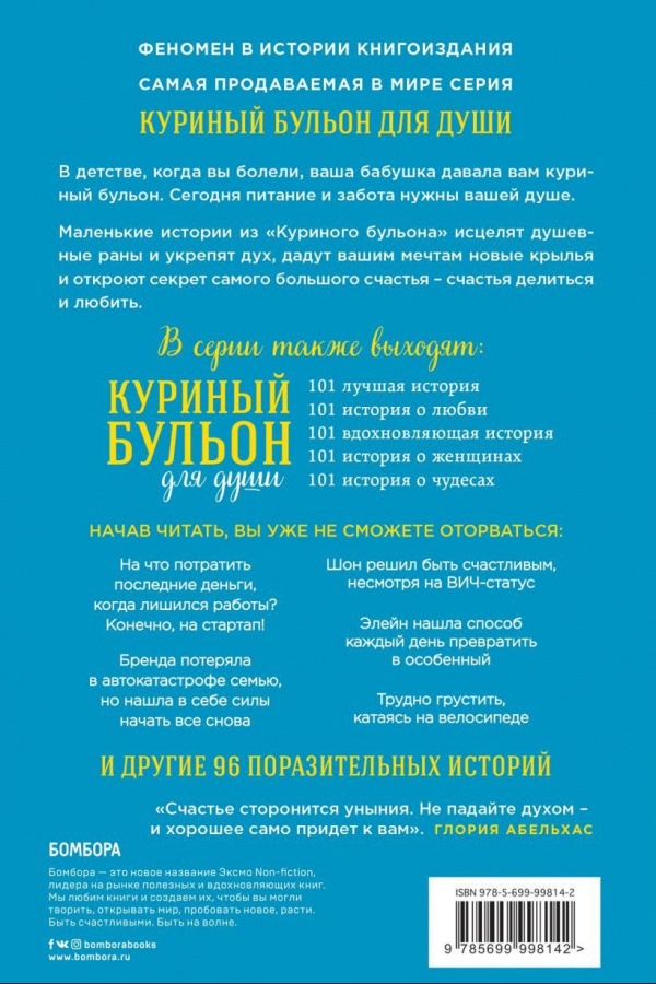 В детстве, когда вы болели, ваша бабушка давала вам куриный бульон. Сегодня питание и забота нужны вашей душе. Маленькие истории из "Куриного бульона" - исцелят душевные раны и укрепят дух, дадут вашим мечтам новые крылья и откроют секрет самого большого счастья - счастья делиться и любить. На что потратить последние деньги, когда лишился работы? Конечно, на стартап! Бренда потеряла в автокатастрофе семью, но нашла в себе силы начать все снова. Шон решил быть счастливым, несмотря на ВИЧ-статус. Лишившись работы, Мэтт и подумать не мог, что это станет для него большой удачей. Оказывается, чтобы провести лучший отпуск в жизни, Шейле с мужем нужно было потерять паспорт и все деньги. Трудно грустить, катаясь на велосипеде. И другие 95 поразительных историй, от которых вы не сможете оторваться.